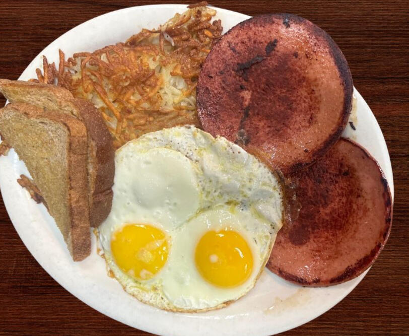 | 2 or 3 Eggs , Hash Browns, fried, or grilled pork tenderloin, bread & drink (Free Coffee, Tea or Soft Drink) |